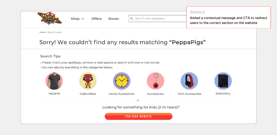 Solution: Added contextual messaging and a CTA on the "no results" page directing users to the kids' site when searching for children's products.