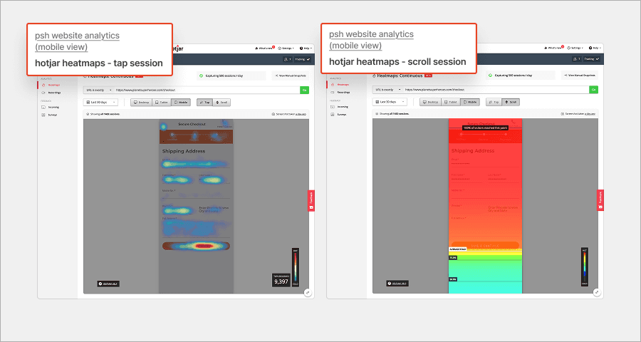 Behavioral analysis: Hotjar heatmaps and user session recordingsQuantitative metrics: Google Analytics performance data