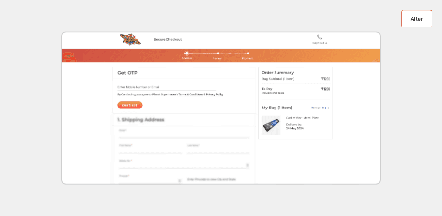 Solution: Simplified checkout to mobile number authentication only - eliminating unnecessary steps while maintaining user data collection.